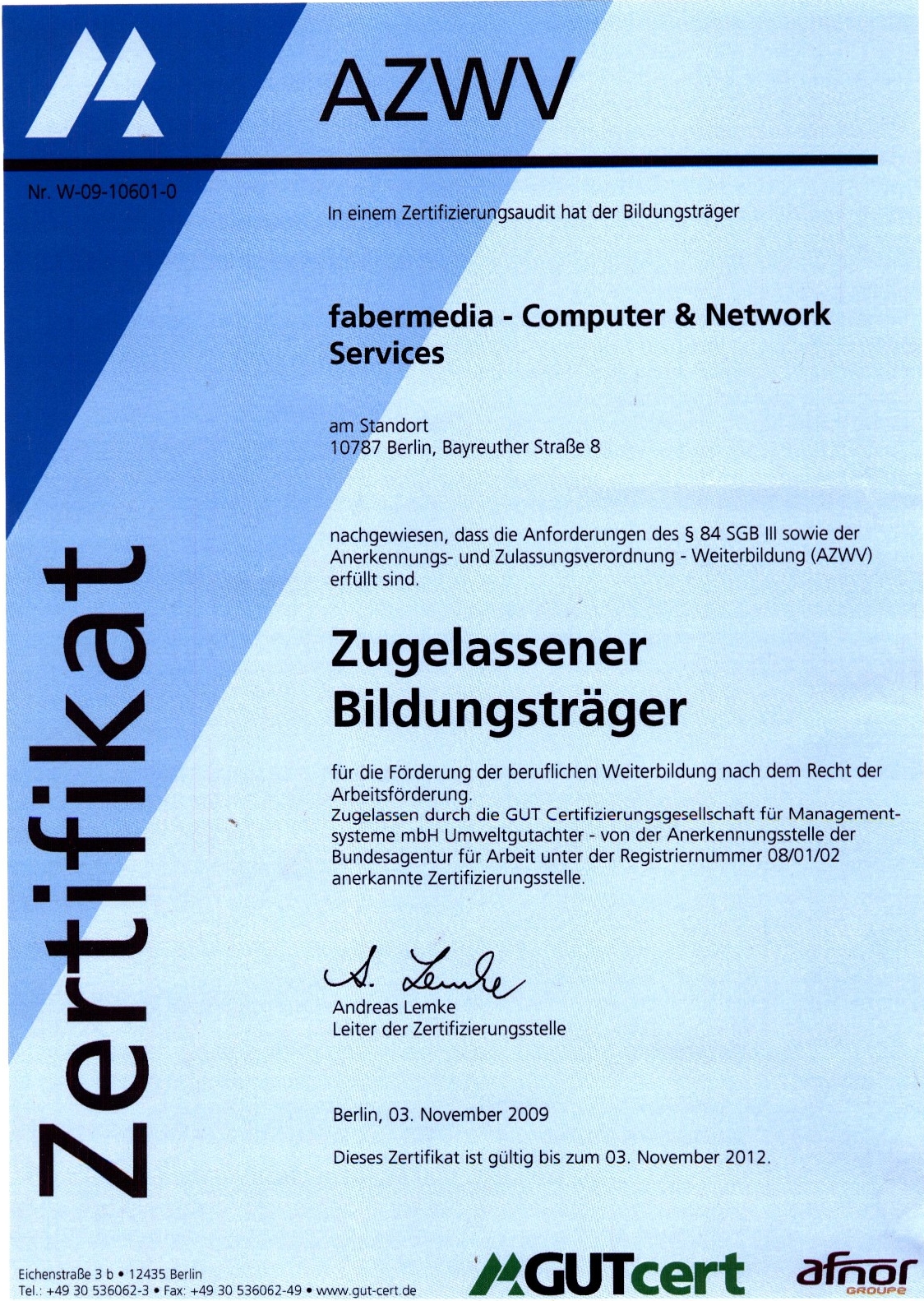 | November 2009 | Erweiterung des Schulungsangebotes auf berufliche Weiter- und Fortbildung mit entsprechender Einführung eines QM-Systems und Zertifizierung des Unternehmens nach AZWV.